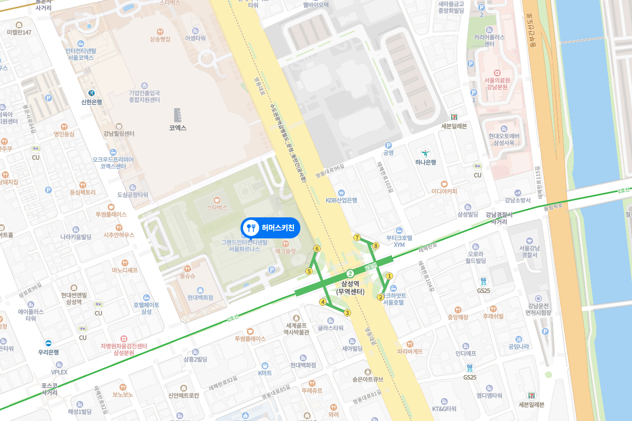 ※ 허머스 키친 찾아가는 길 : 지하철 2호선 삼성역 5,6번 출구 쪽 파르나스 몰 연결통로, 파르나스 몰 지하 1층 위치