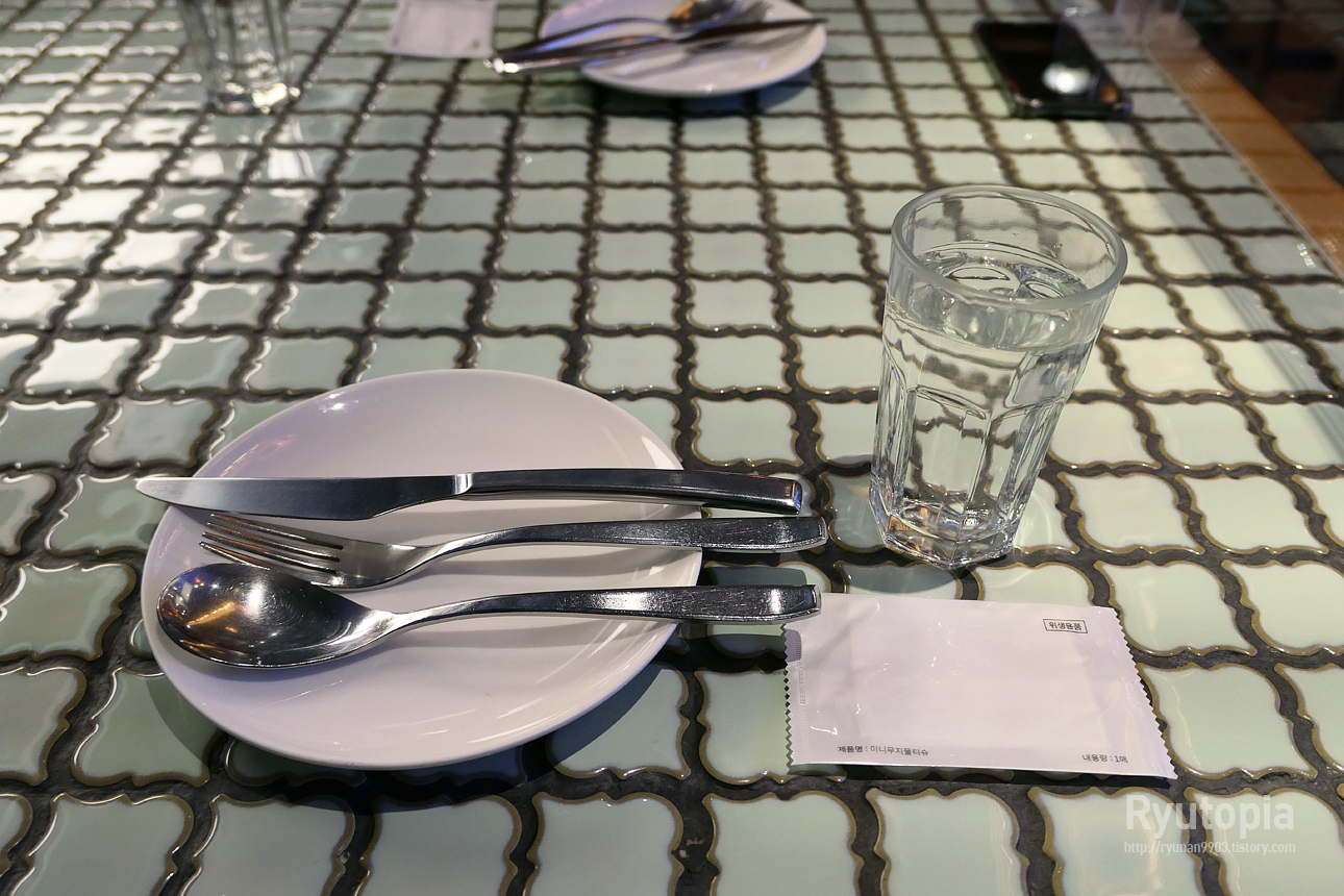 물 한 잔 따라놓고 앞접시, 식기류와 함께 기본 식기 세팅 완료.