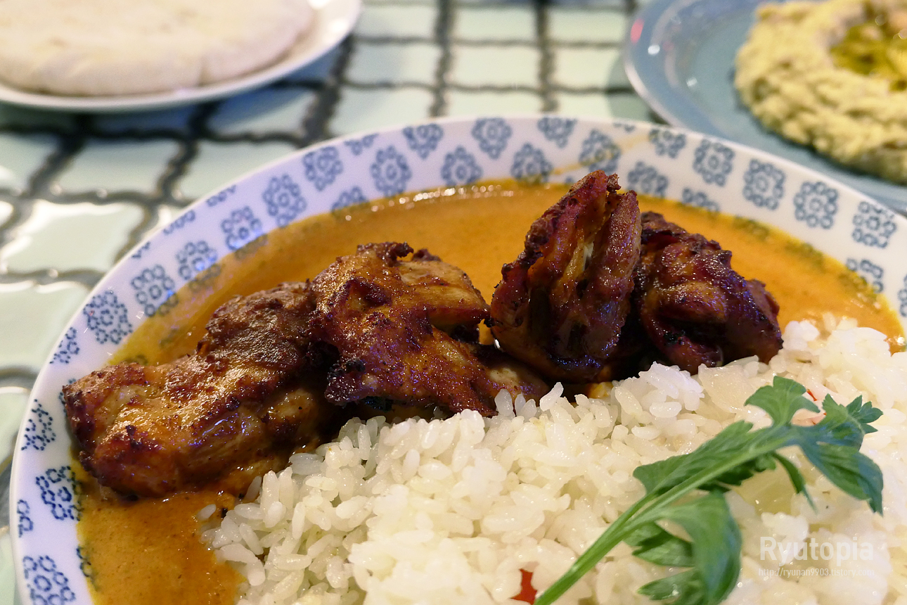 저희가 주문한 메뉴는 커리 두 종, 그리고 사이드로 선택한 갈릭 후무스와 피타 브레드 한 개.