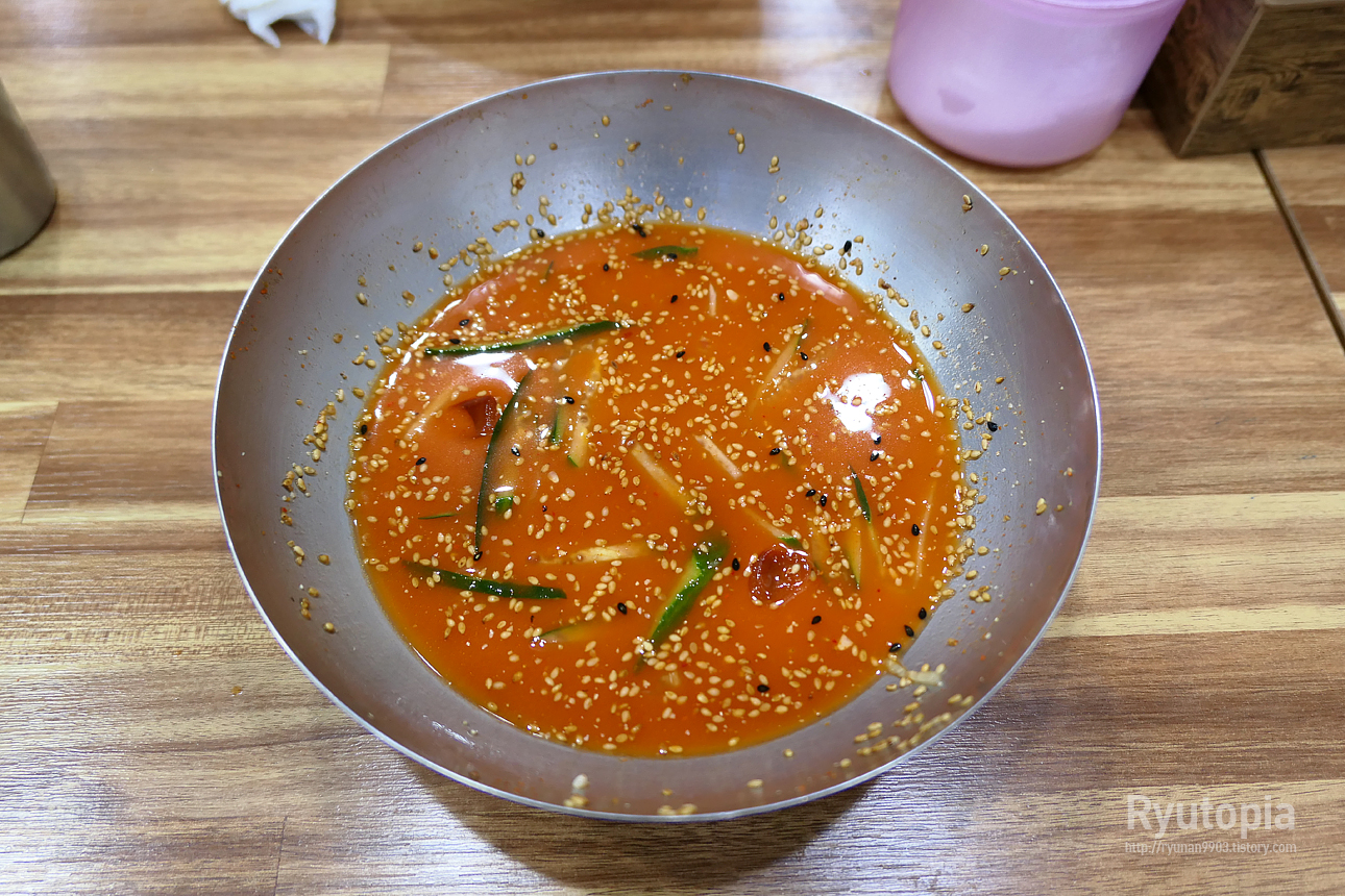 살짝 새콤하면서 얼큰한 뒷맛이 감도는 게 그 강원도 속초, 강릉 물회 있죠, 물회 육수맛과 꽤 유사한데