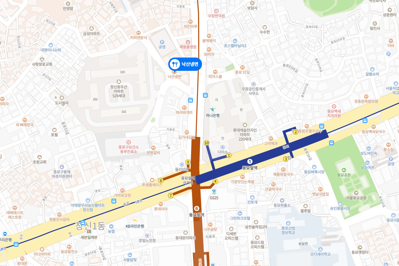 ※ 낙산냉면 찾아가는 길 : 지하철 1, 6호선 동묘앞역 9번출구 하차 후 창신역 방향 직진, 파리바게뜨 앞에서 좌회전