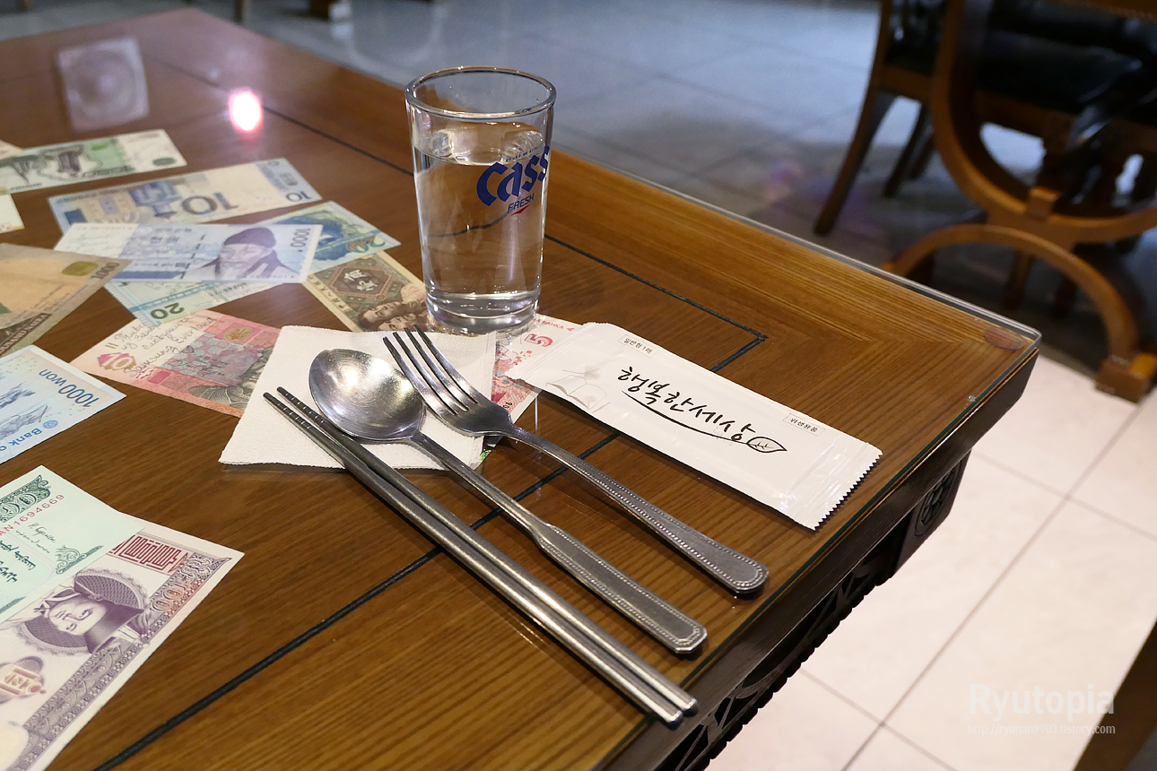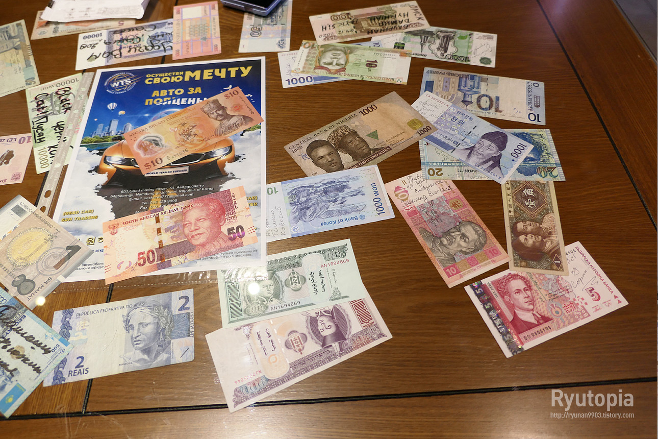 모든 테이블마다 유리 아래에 각 국가의 지폐가 들어있는 것이 특징.