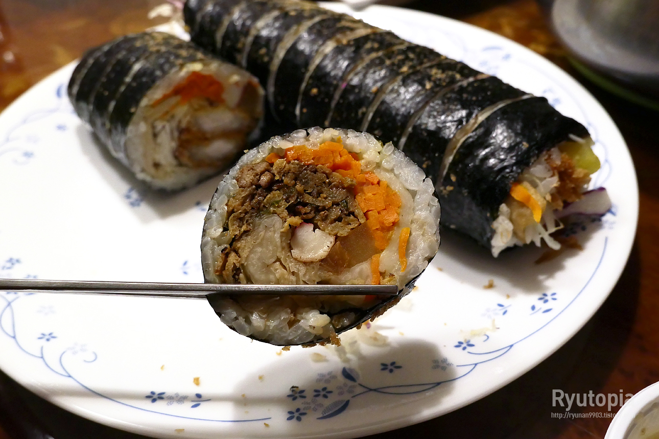 김밥 단품으로 먹을 땐 돈까스김밥, 라면 등과 곁들여 함께 먹을 땐 묵땡김밥을 선택하는 게 더 나을 것 같아요.