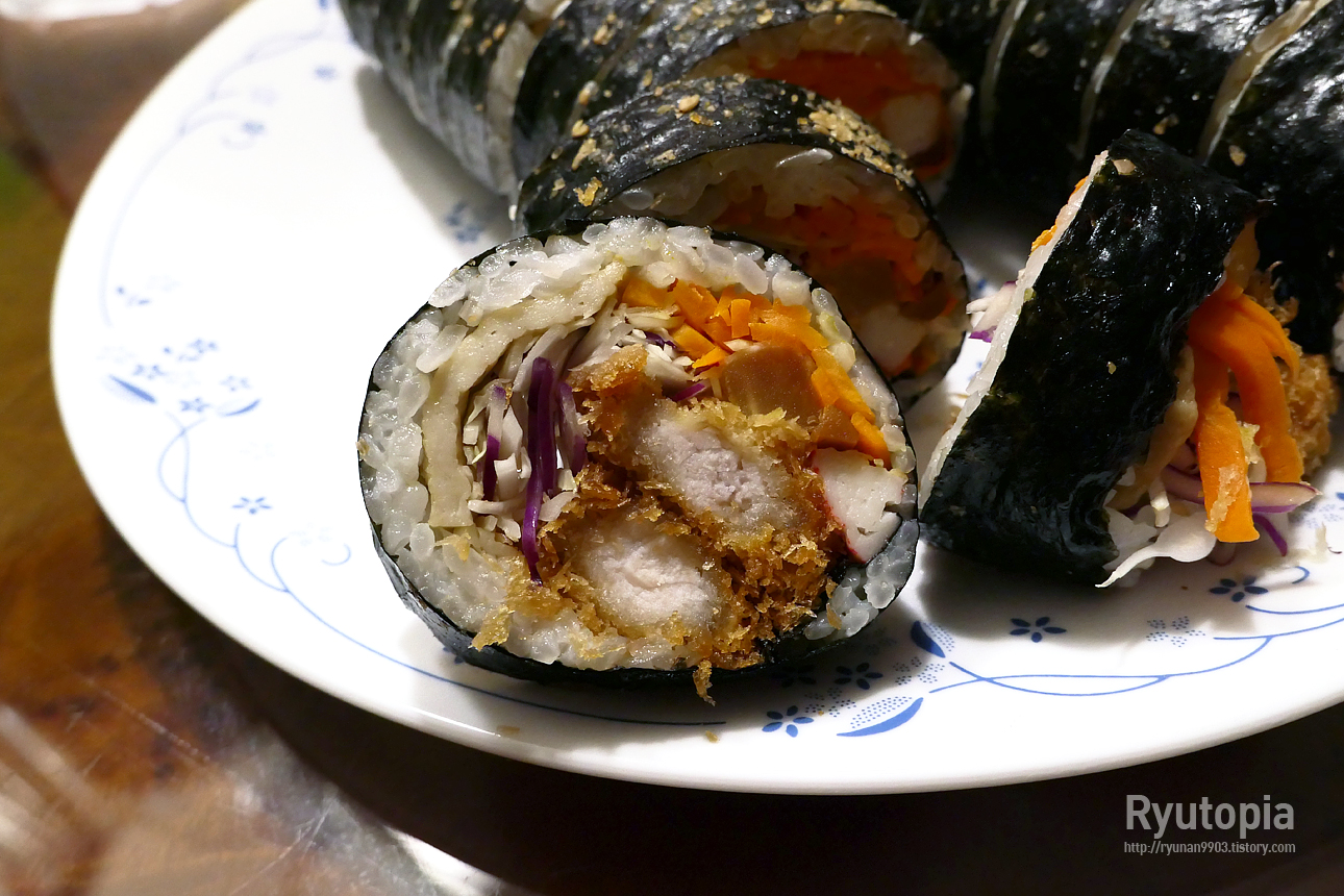 아무래도 갓 튀긴 돈까스가 생명인 김밥인데, 다른 재료의 수분 때문에 바로 먹지 않으면 눅눅해질 수밖에 없는데