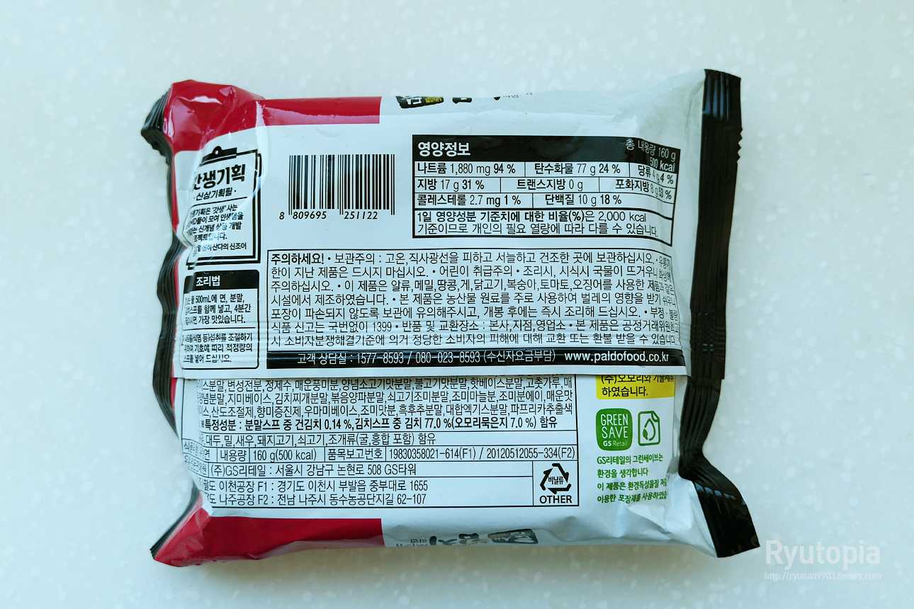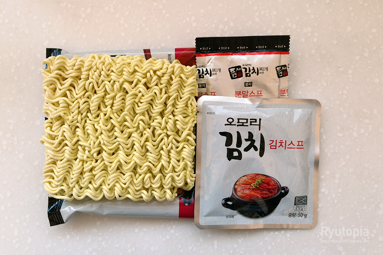 다른 라면에 비해 중량이 높은 이유는 오모리김치 레토르트 파우치가 함께 들어있기 때문.