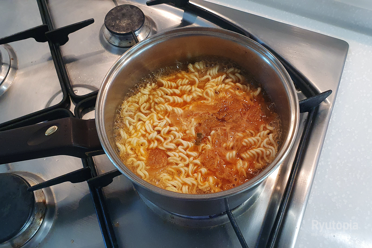 면이 끓었을 때 두 종류의 스프를 한번에 넣고 약 4분 정도 더 끓이면 완성됩니다.