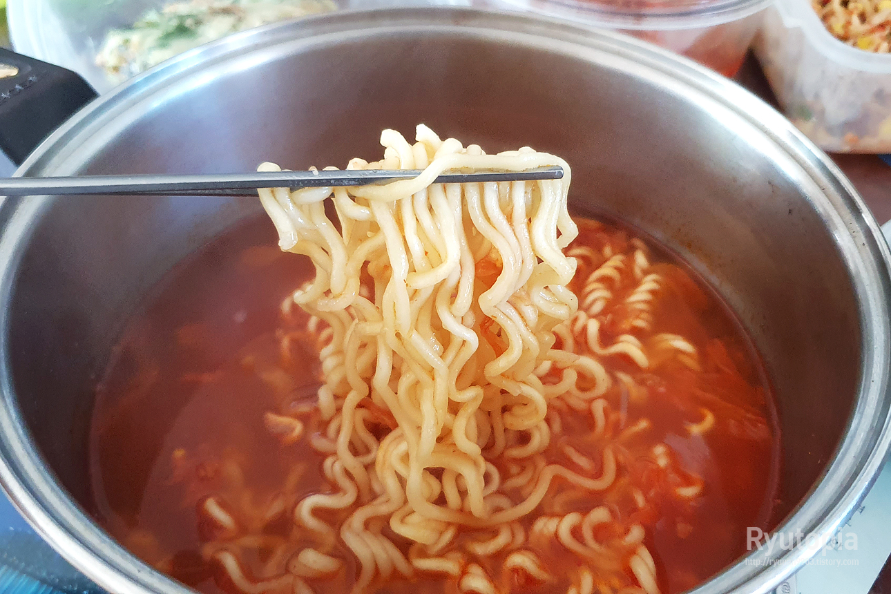 당연히 기존 오모리 김치찌개 라면보다는 훨씬 맵긴 합니다만, 의외로 오리지널 틈새라면보다는 덜 매운 편이라