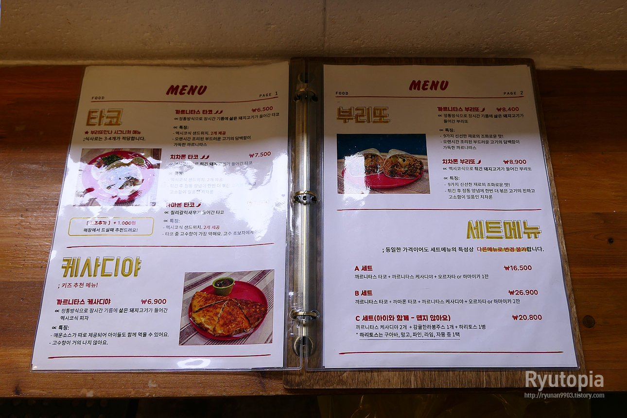 간판 메뉴는 멕시코식 타고, 그리고 부리또 두 가지입니다.