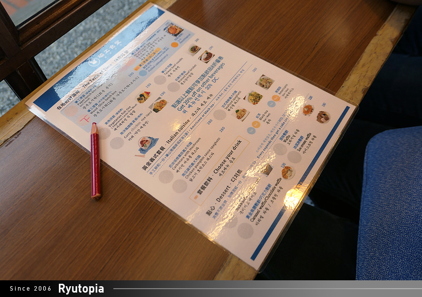 테이블에 있는 메뉴판. 대표메뉴인 광부도시락 이외에도 카레, 우육면, 파스타 같은 다른 식사류도 팔고 있습니다만
