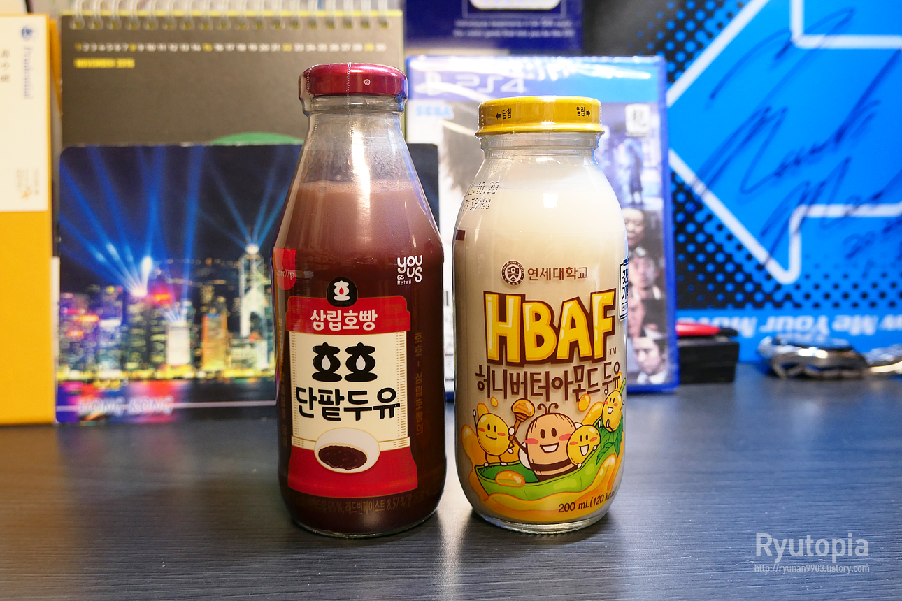 편의점에서 꽤 재미나고 이색적인 병 두유 두 가지를 구매했습니다.
