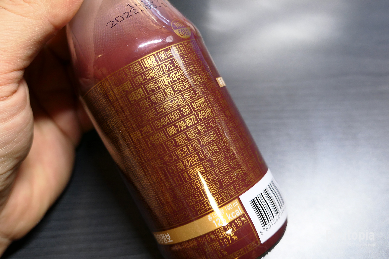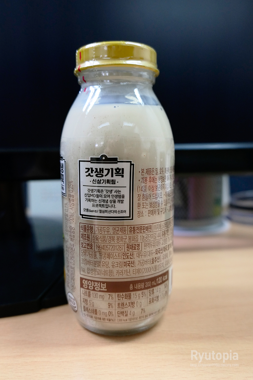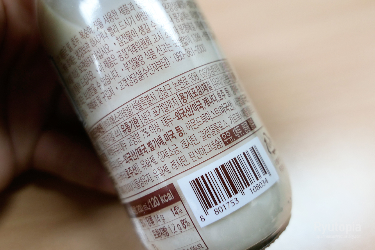 측면에는 제품의 원재료 및 함량 등의 정보와 영양성분표가 인쇄되어 있습니다. 200ml 한 병 열량은 120kcal.