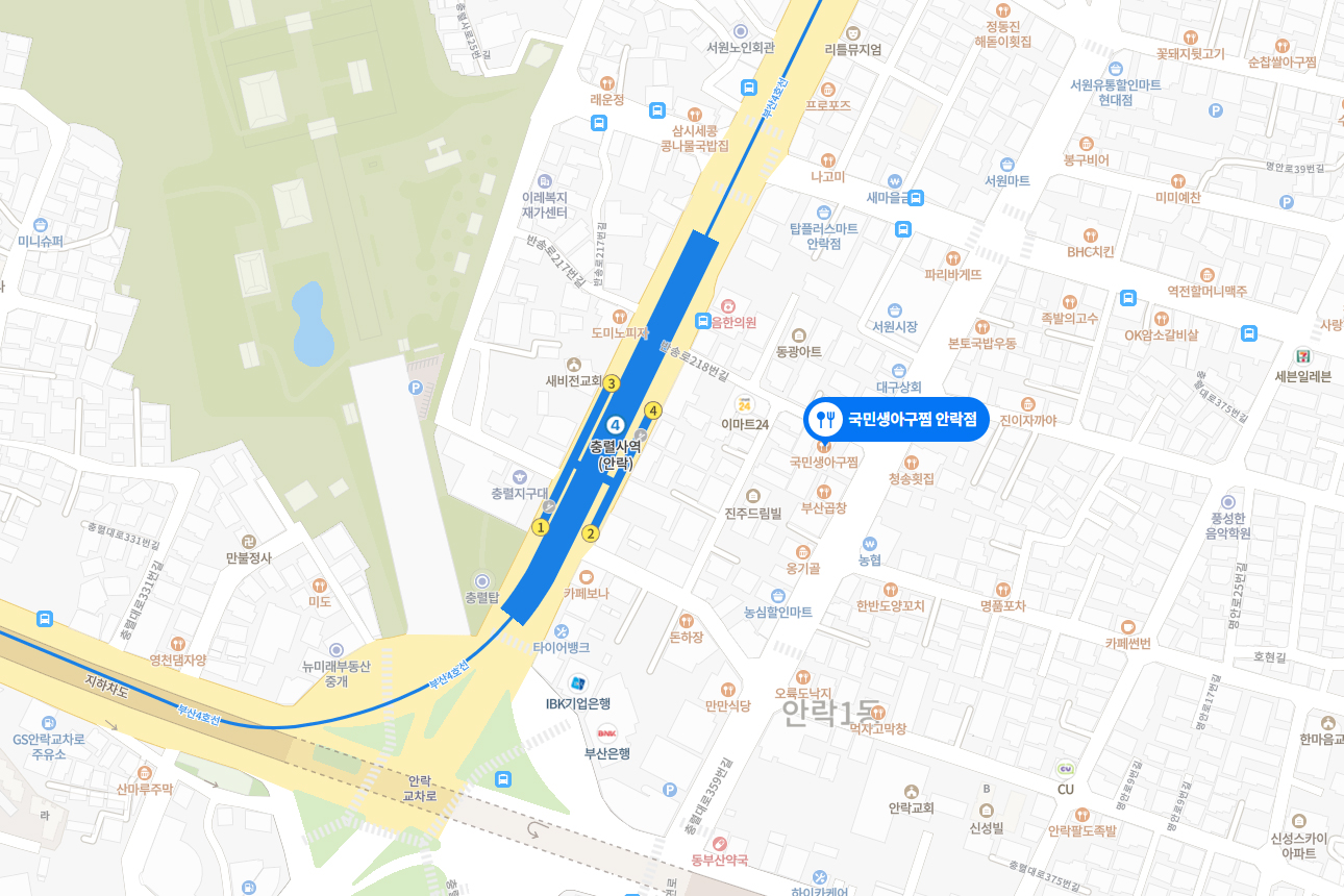 ※ 국민생아구찜 안락점 찾아가는 길 : 부산지하철 4호선 충렬사역 4번출구 하차, 바로 앞 골목에서 우회전 후 직진
