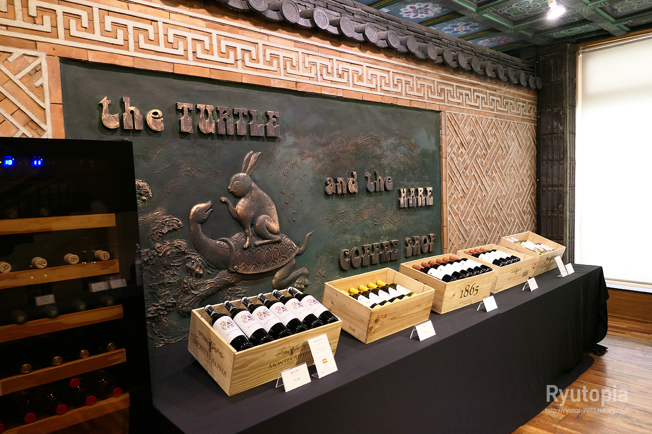 레스토랑 입구에 와인 셀러와 함께 각종 와인들이 진열되어 있습니다.