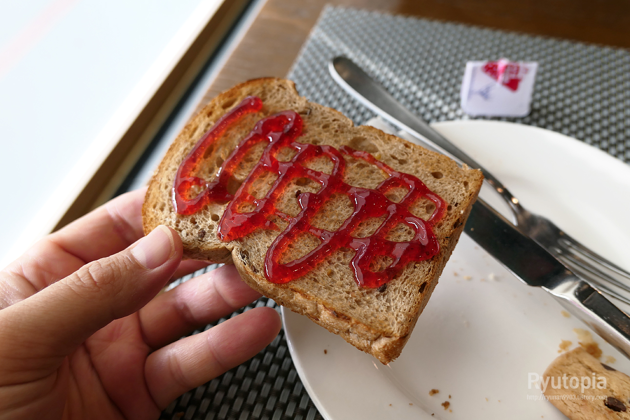 갓 구운 곡물식빵 위에 딸기잼 발라서 바삭바삭 맛있게...