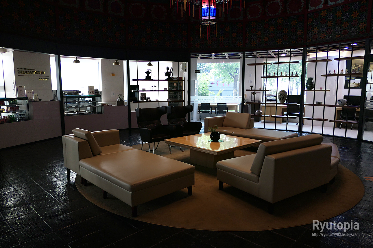 저 소파 위에 코모도 호텔의 상징인 청사초롱 샹들리에가 매달려 있습니다.