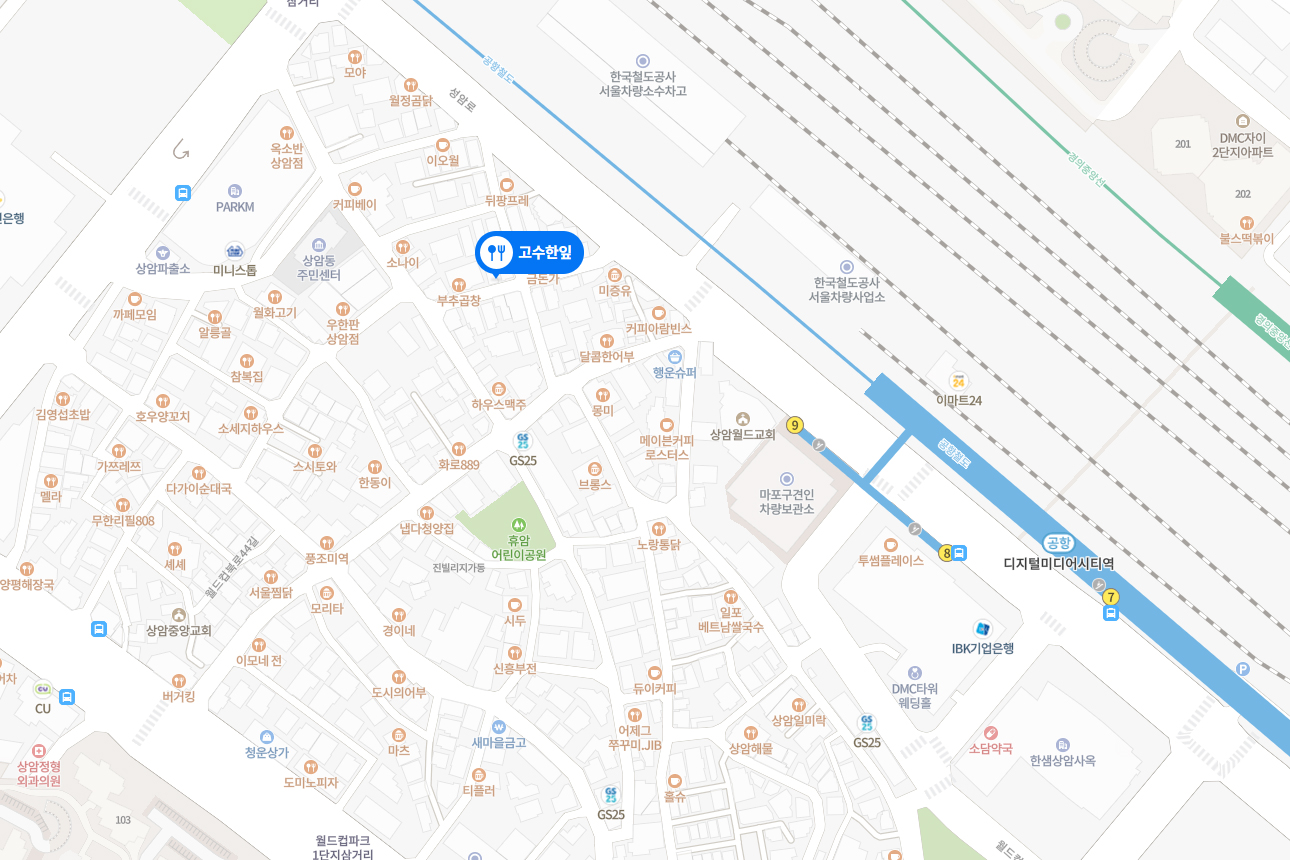 ※ 고수한잎 찾아가는 길 : 지하철 6,경의중앙,공항철도 디지털미디어시티역 9번출구 하차, 도보 약 180m 정도