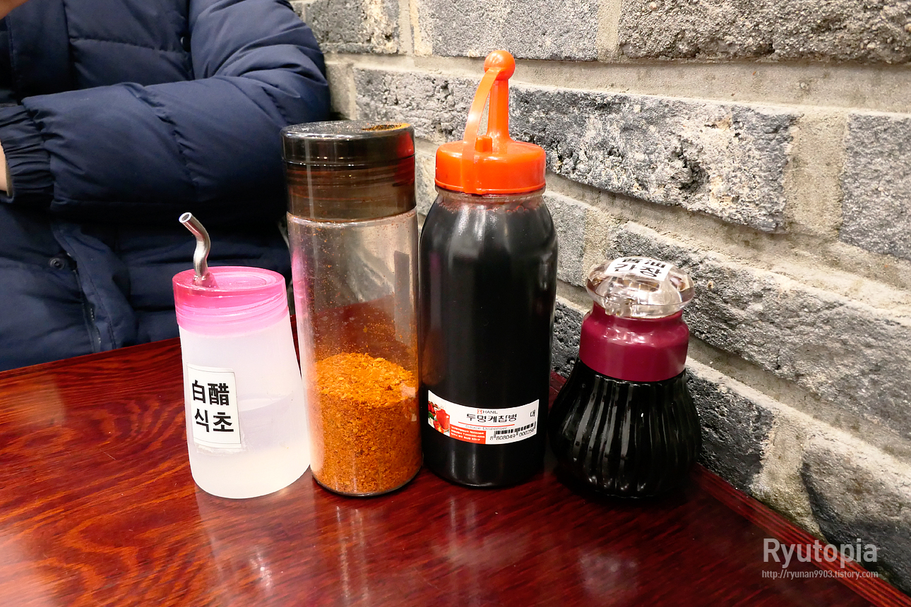 테이블에 네 종류의 양념통이 있는데, 각각 식초, 고춧가루, 흑식초, 그리고 간장.