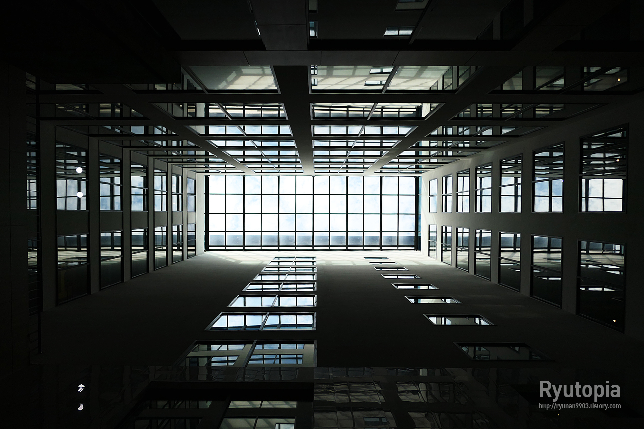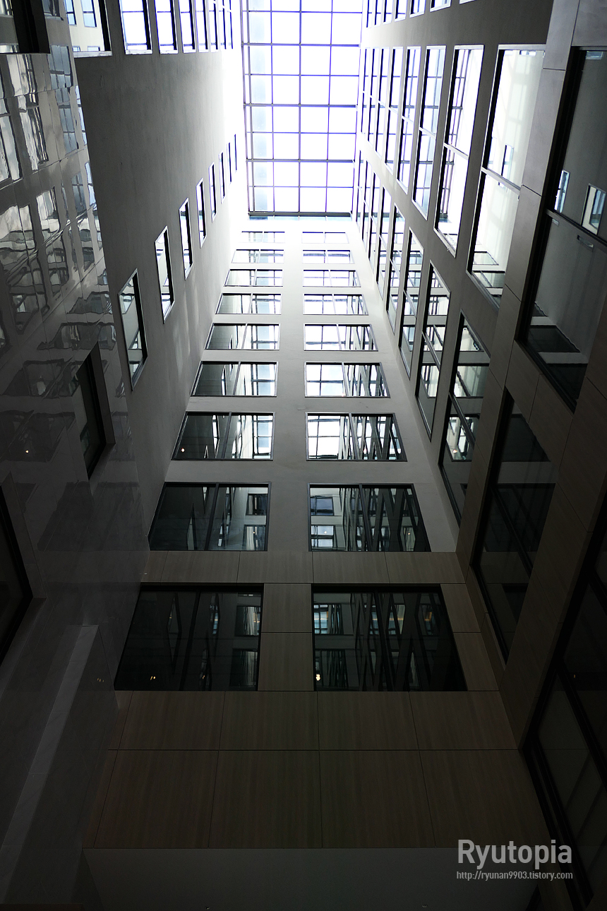 1층 로비로 내려와 천장을 다시 한 번 봤는데, 여기 자연채광이었네...