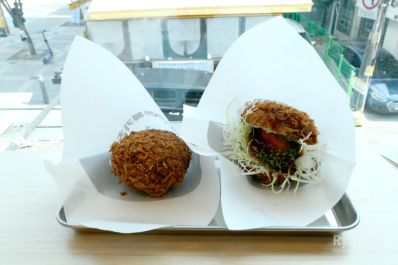 왼쪽이 기본 '연돈볼카츠', 그리고 오른쪽이 '데리야끼 볼카츠 버거' 입니다.