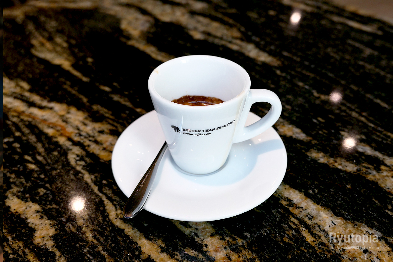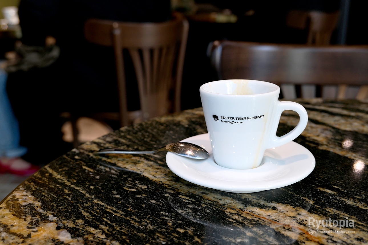 리사르에서 마시는 에스프레소는 기본이 샷 하나입니다. 그래서 용량이 30ml 정도로 아주 적은 편이에요.