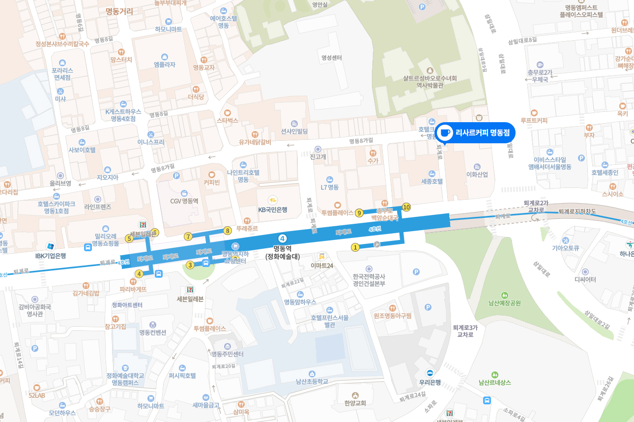 ※ 리사르커피 명동점 찾아가는 길 : 지하철 4호선 명동역 10번출구 하차, 세종호텔을 끼고 좌회전 후 골목 코너에 위치