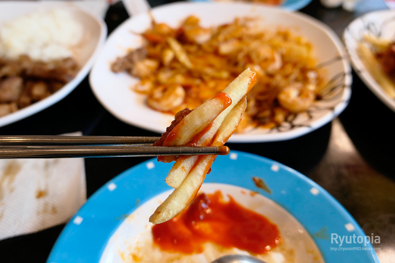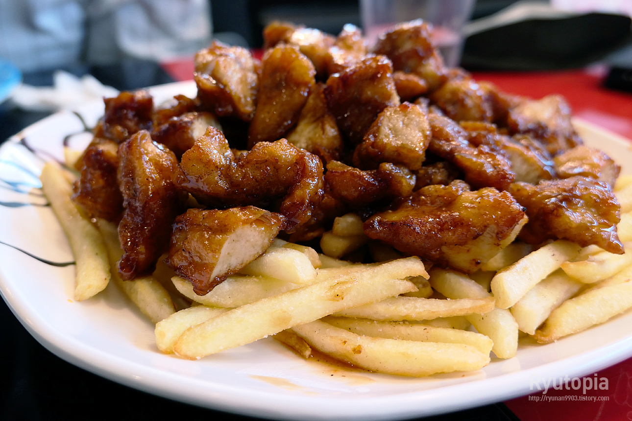 몇몇 요리들의 경우 기본이 밥으로 나오긴 하지만 밥 대신 사이드를 감자튀김으로 변경하는 것도 가능하다고 합니다.