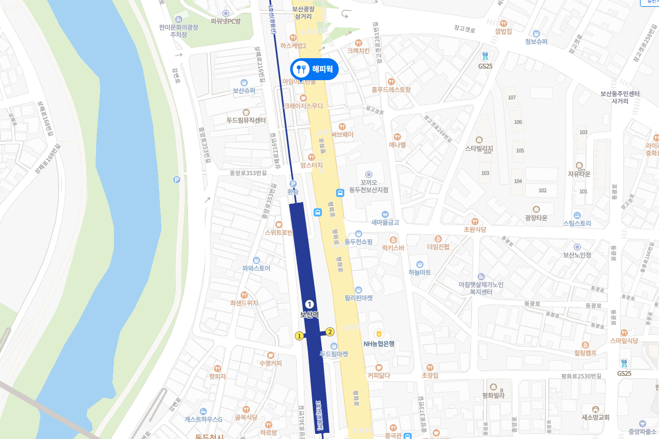 지금은 규모가 크게 줄어들었지만 미군기지가 있는 '캠프 보산' 이 위치해 있어 부대를 중심으로 개성있는 식당이