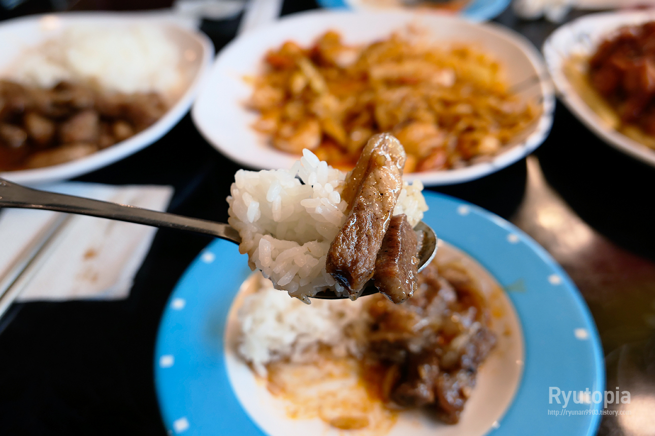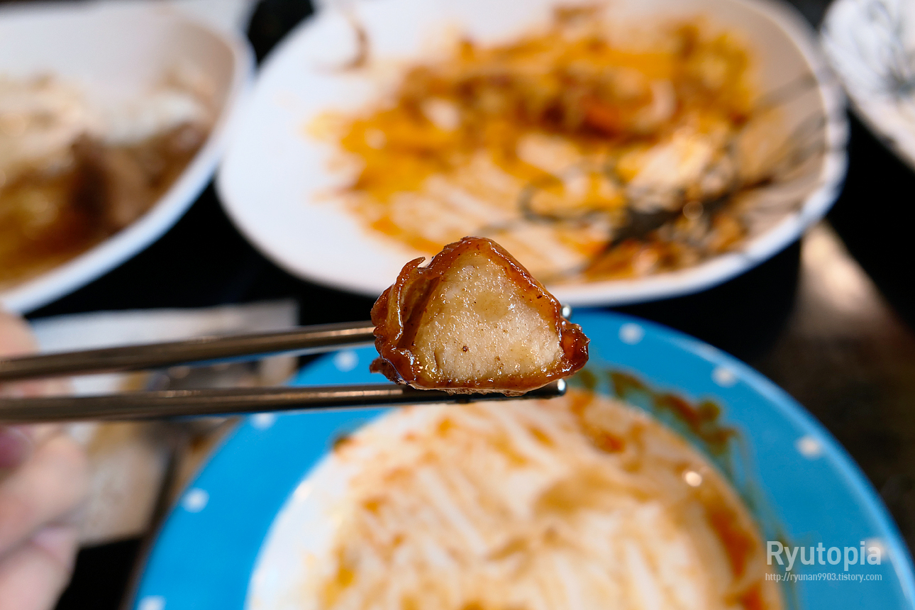 접시에 흰쌀밥과 함께 간장양념에 진하게 볶아낸 한 입 크기의 돼지고기가 넉넉하게 담겨 나오더군요.