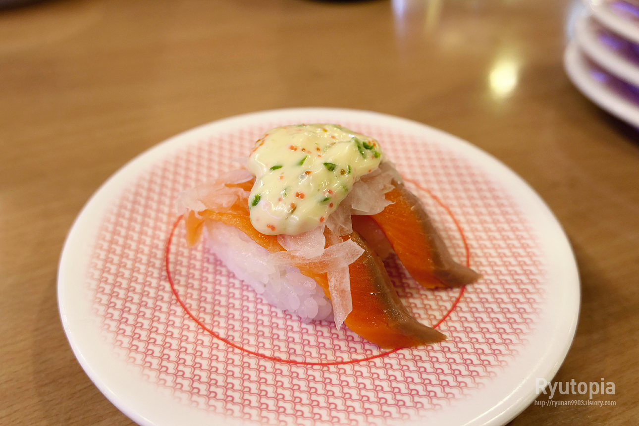 이름이 뭔가 복잡한데 그냥 연어 구운 것 위에 마요네즈와 통후추를 뿌린 것. 그나마 구우니 많이 괜찮아졌습니다.