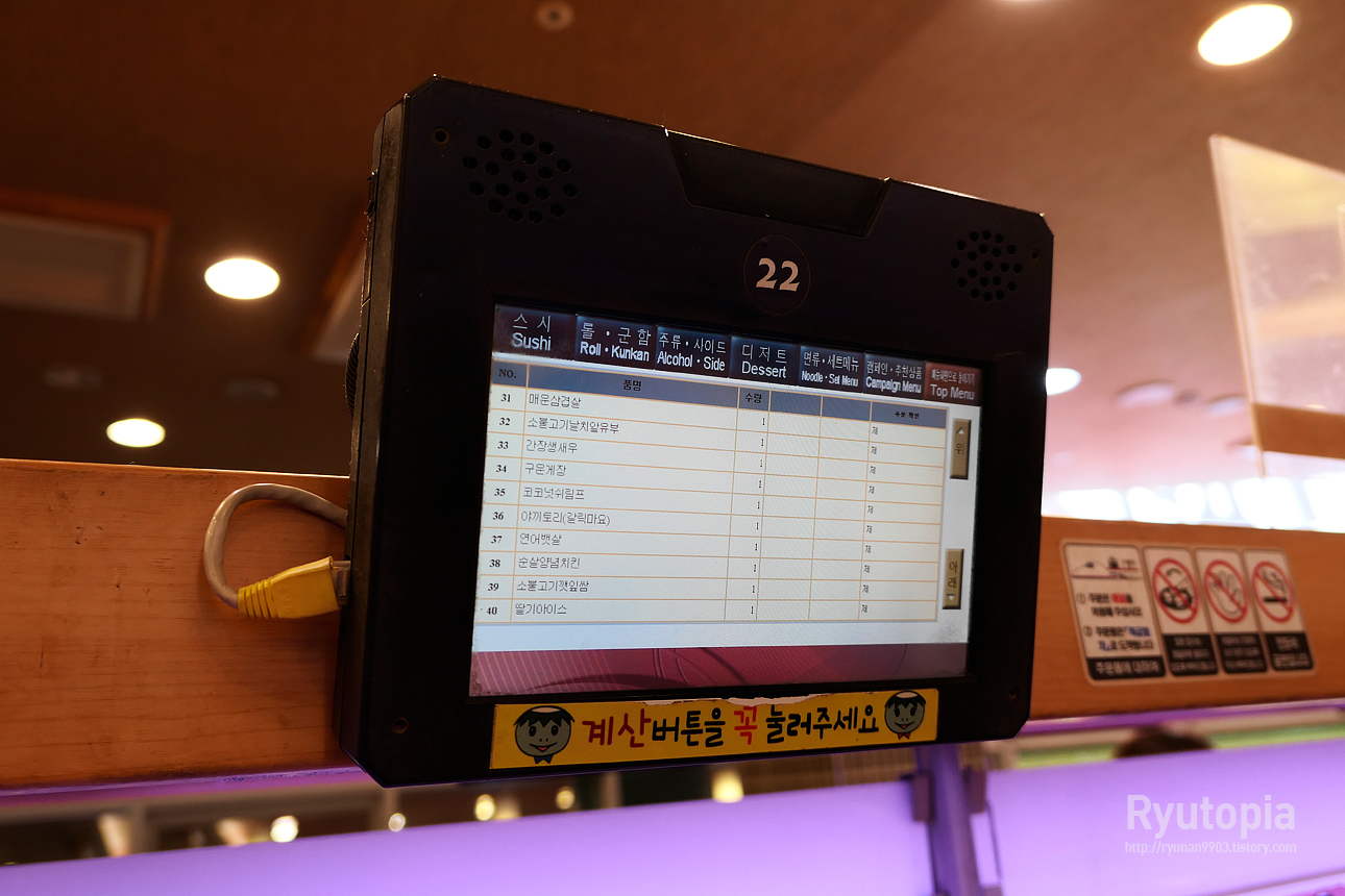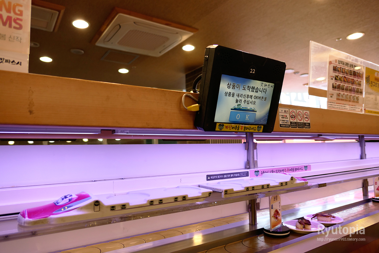 이런 레일에 초밥이 담겨 나오는데, 초밥을 내린 뒤 모니터의 'OK' 버튼을 누르면 레일이 다시 되돌아갑니다.