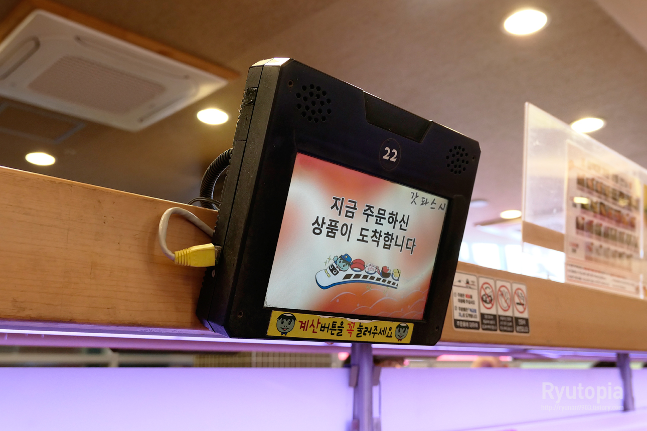 모니터의 터치 스크린을 통해 초밥을 주문한 뒤 초밥이 도착하기 전 모니터에 이렇게 도착 알림 화면이 뜹니다.