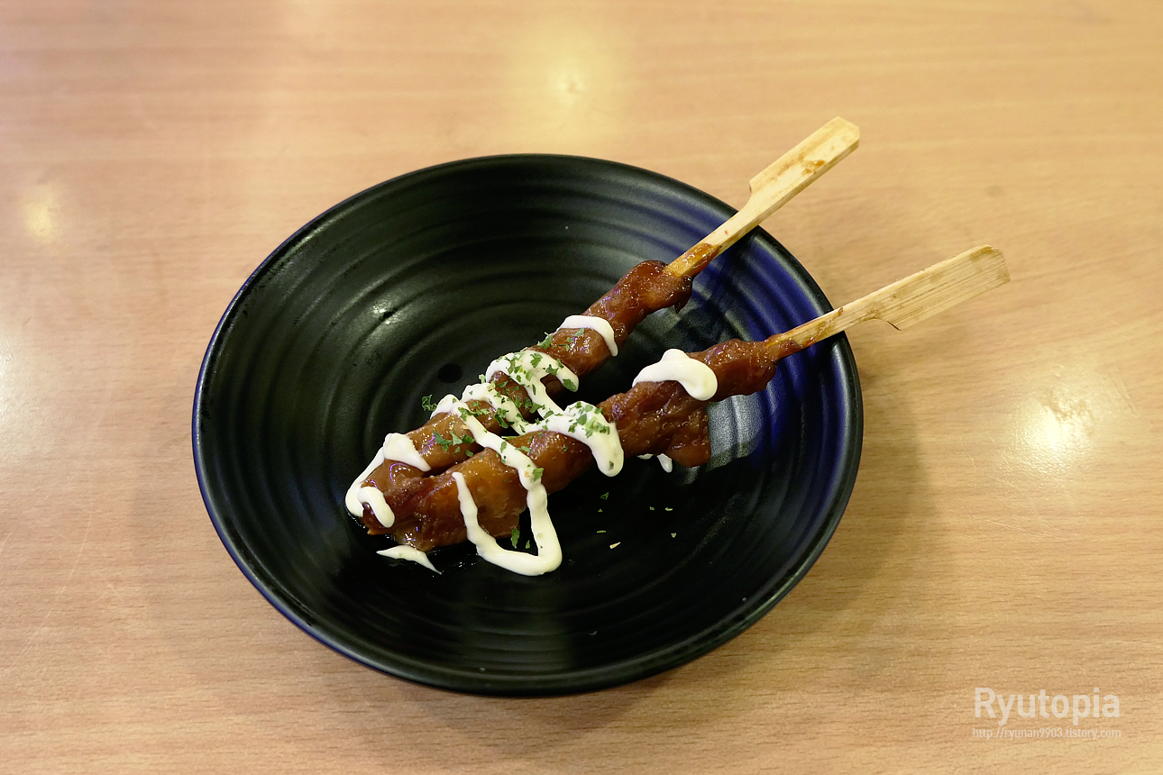 달콤한 양념에 구운 닭꼬치 위에 갈릭마요 소스를 얹은 것. 역시 맥주 안주 생각나게 하는 메뉴.