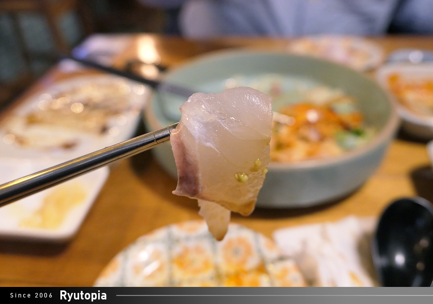 광어는 살짝 간장을 찍은 뒤 묵은지와 함께 먹었는데, 묵은지와의 조합이 아주 잘 어울립니다. 이거 괜찮네요.