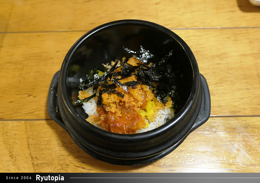 뜨겁게 달궈진 뚝배기 안에 지글지글 끓는 소리와 함께 알밥이 담겨 나왔습니다.