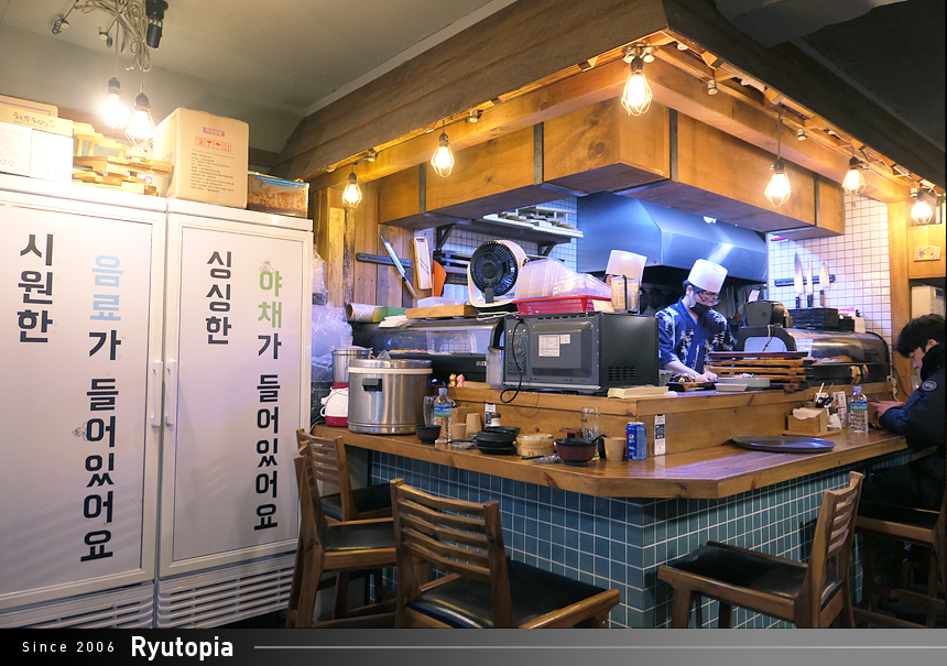 가게 내부는 그리 넓지 않습니다. 주방과 붙어있는 바 테이블을 중심으로 일반 테이블이 여러 개 놓여져 있는 모습.