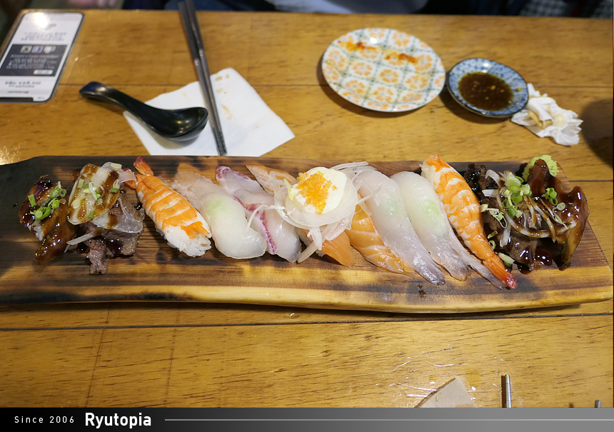 초밥은 인당 6점씩, 2인분에 해당되는 열두 점의 초밥이 길다란 나무도마 위에 한꺼번에 담겨 나옵니다.