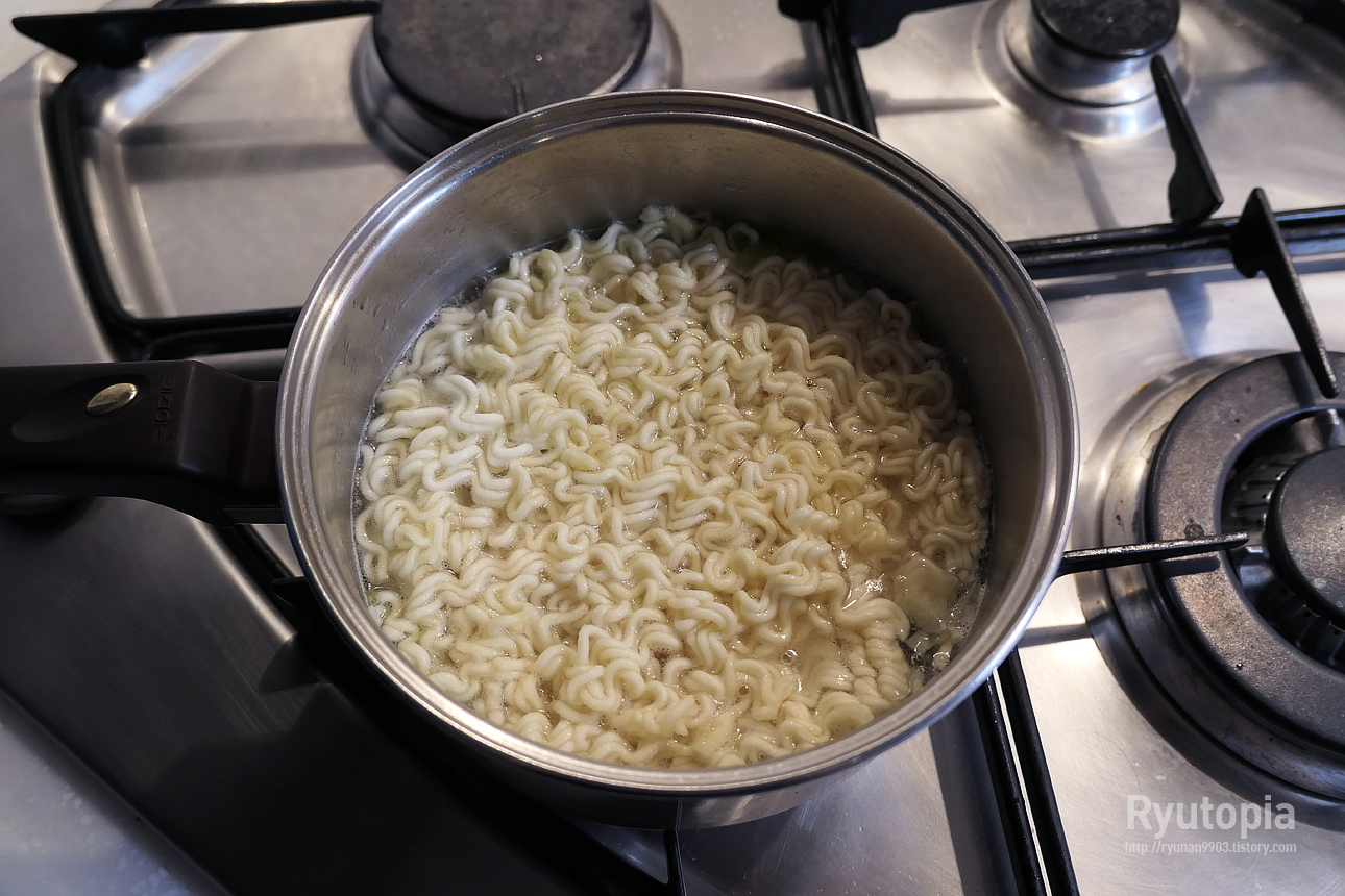 끓는물에 면, 그리고 건더기 후레이크를 넣고 약 3분 30초간 끓입니다.
