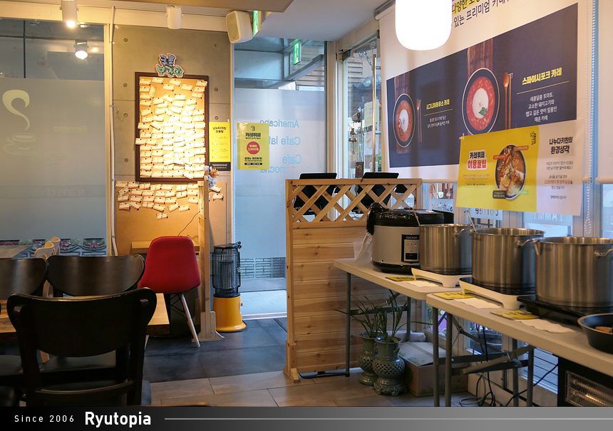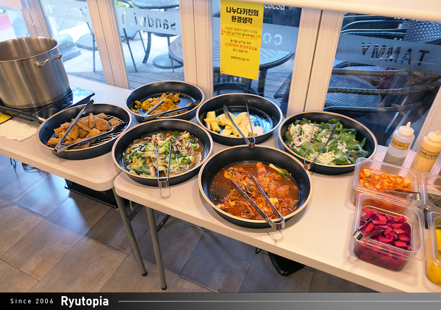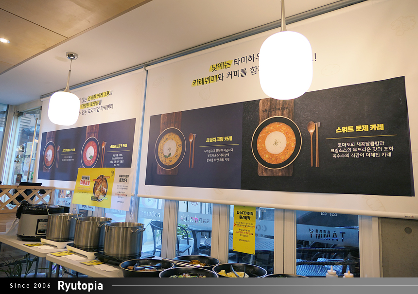 평일 점심 시간에 한정해서만 카페가 식당으로 탈바꿈, 나누다키친 카레뷔페로 운영되고 있습니다.