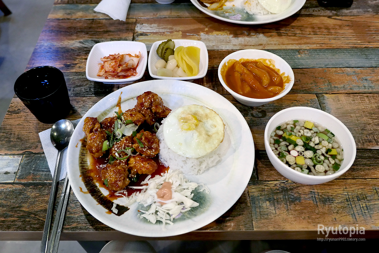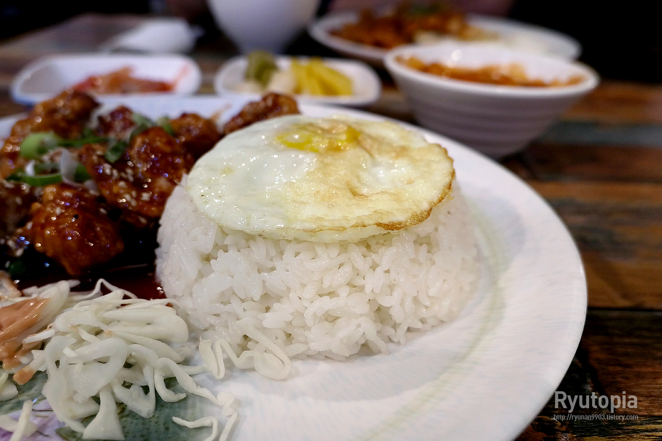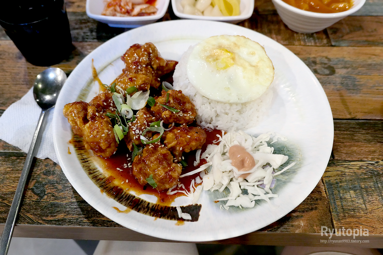 접시에 담겨나온 음식 구성은 밥과 계란후라이, 약간의 채썬 양배추, 그리고 메인이라 할 수 있는 스파이시 치킨.