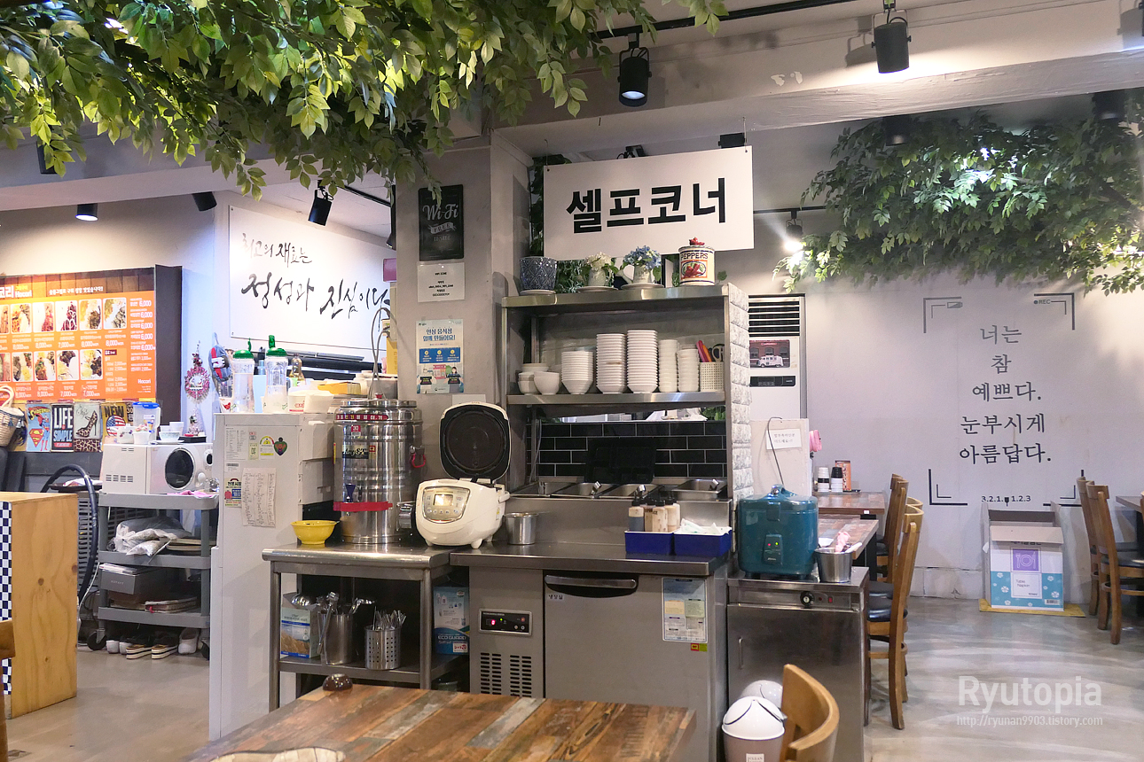 치킨과 밥이 담겨 있는 메인 음식은 주방에서 사장님이 가져다주시고 나머지는 직접 셀프로 가져오면 됩니다.