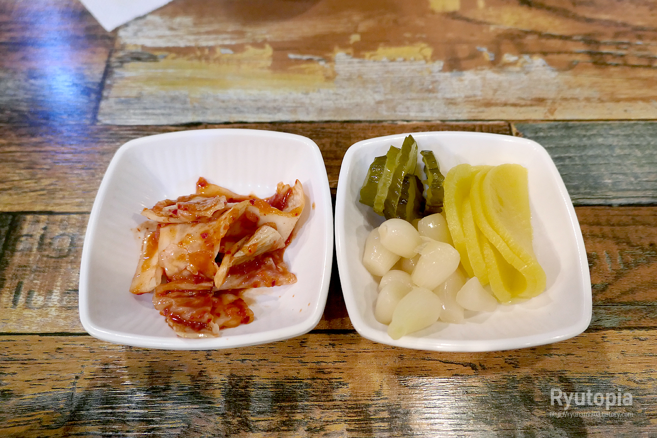 반찬으로는 배추김치, 오이피클, 락교, 단무지 네 가지가 제공.