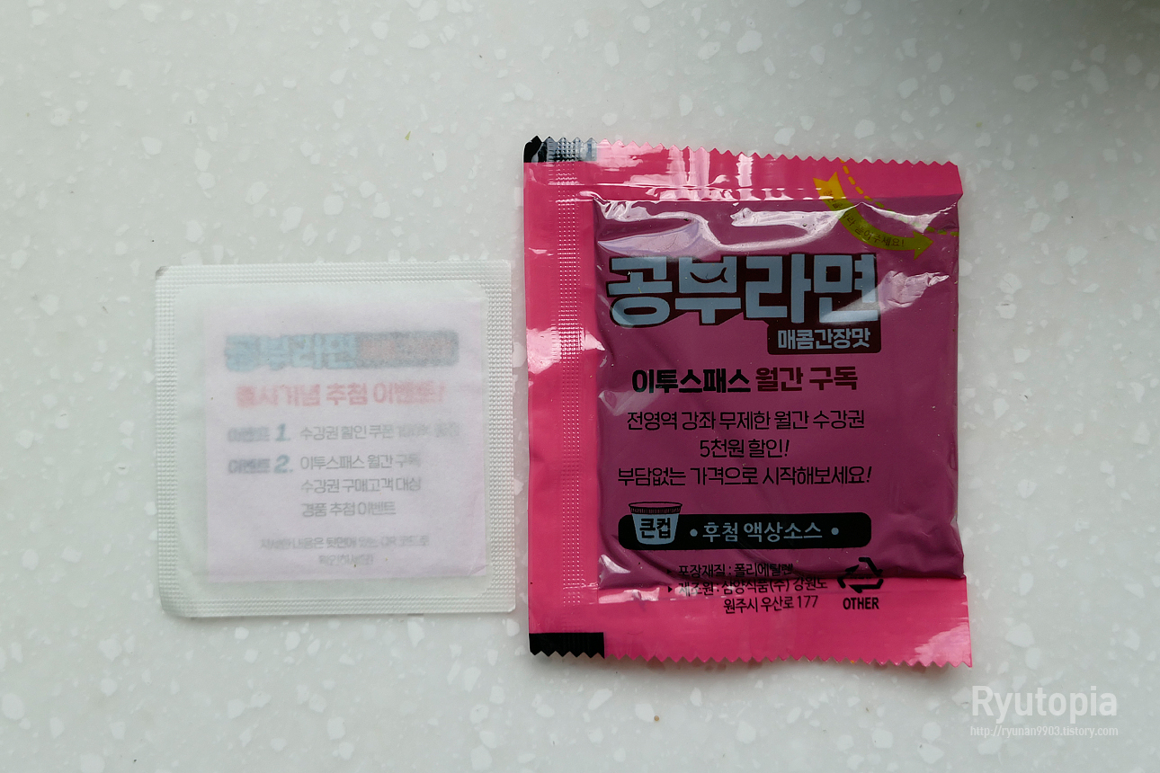 그리고 별첨으로 액상 스프와 함께 공부라면 출시기념 5,000원 할인 쿠폰이 함께 들어있고요.