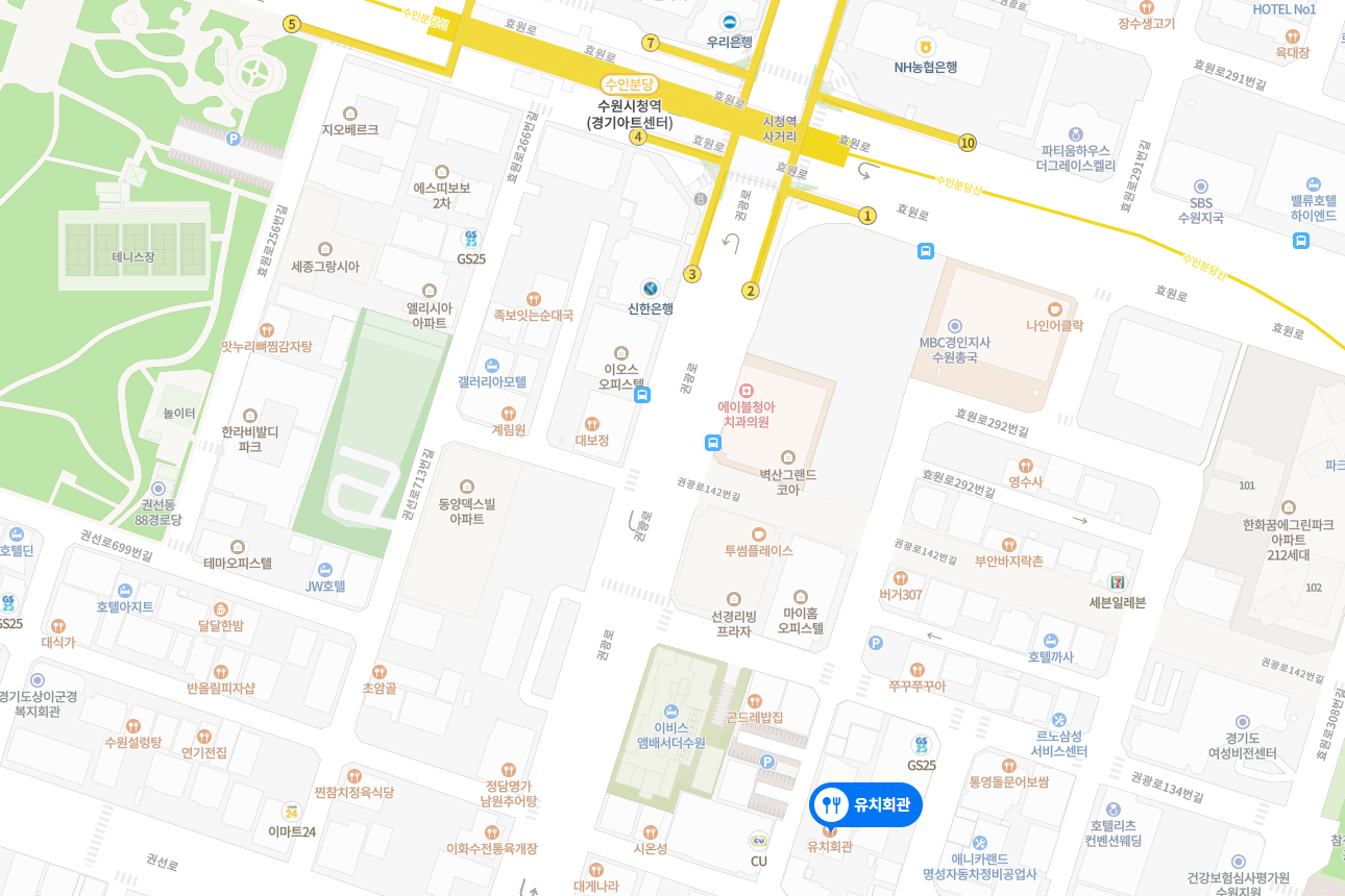 ※ 유치회관 찾아가는 길 : 수도권 전철 수인분당선 수원시청역 2번출구 하차 후 직진, 이비스엠배서더에서 좌회전, 안쪽