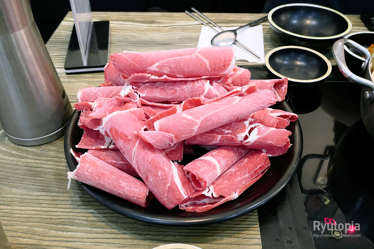 샤브샤브용 고기를 인원수대로 주문하면 중간에 야채와 버섯을 한 번 무료로 추가할 수 있다고 합니다.