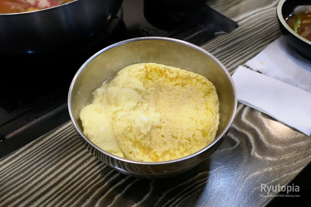 특이하게 고깃집 계란찜마냥 뚝배기에 담겨 팔팔 끓는 상태로 나오는 게 아닌 스테인레스 그릇에 투박하게 담겨 나옵니다.