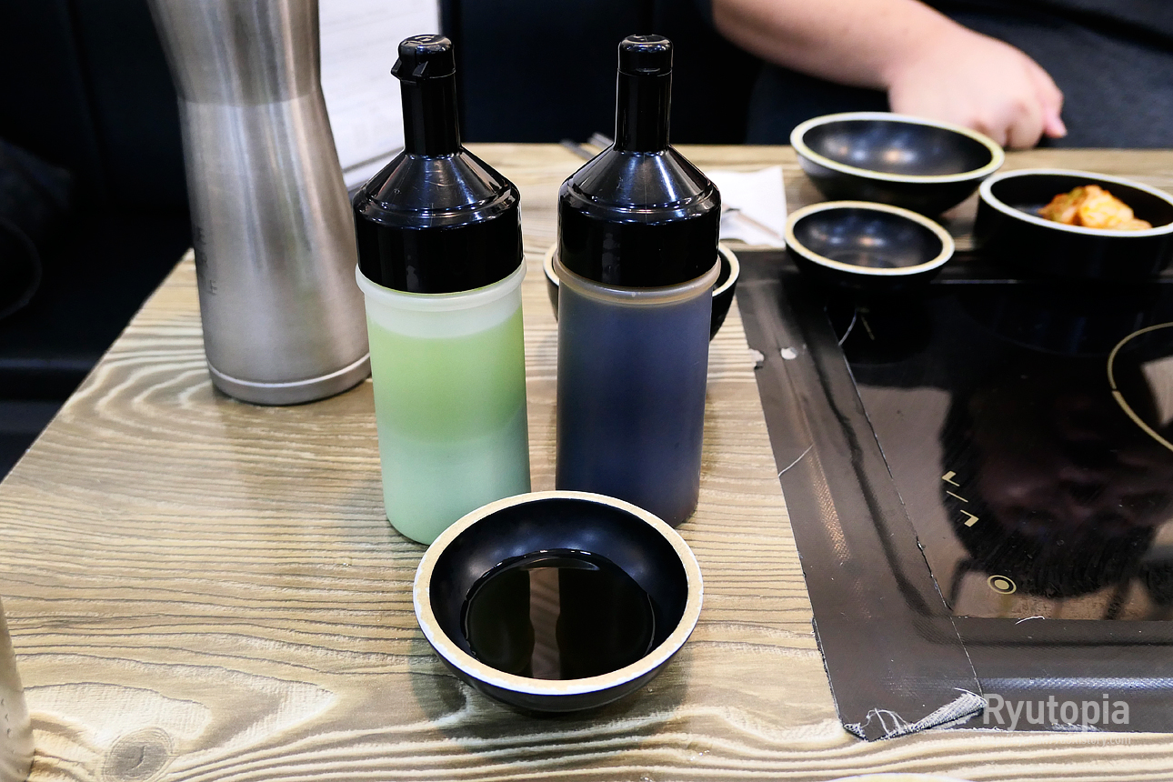샤브샤브 야채와 버섯, 그리고 고기를 찍어먹는 소스로는 간장와 와사비, 두 가지가 통에 준비되어 있어