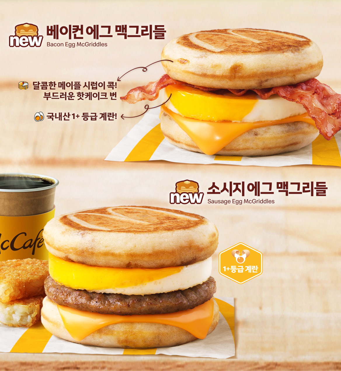 맥그리들은 현재 두 가지 종류로 출시되어 있습니다. '베이컨 에그 맥그리들' 과 '소시지 에그 맥그리들'