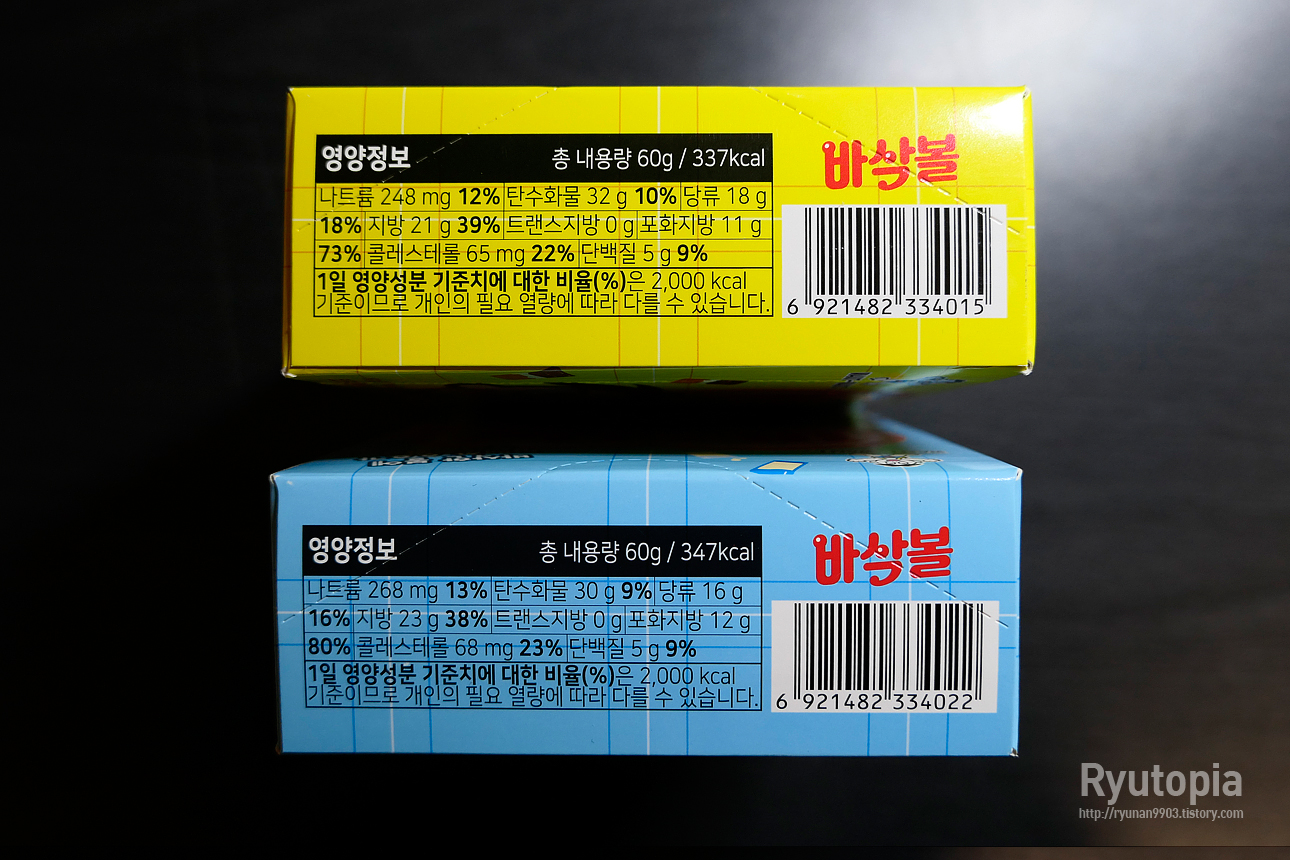 한 곽 중량이 60g으로 이는 홈런볼 한 곽보다 중량이 좀 더 높습니다. 홈런볼이 대략 40g~50g 정도 하니까요.