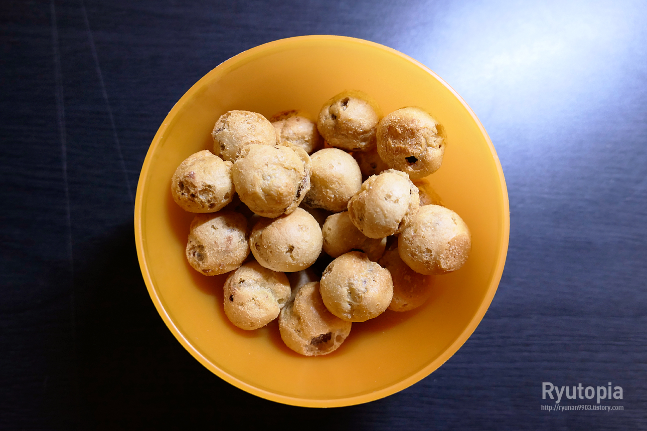 홈런볼보다 약간 더 크고 동글동글한 모양의 슈가 여러 개 들어있습니다. 정확한 갯수는 세지 못했지만요.