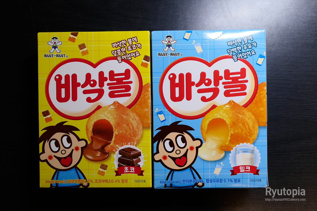 이름 그대로 바삭한 볼 안에 초콜릿, 그리고 우유가 들어있는 제품으로 우리나라 홈런볼과 비슷한 컨셉의 상품입니다.